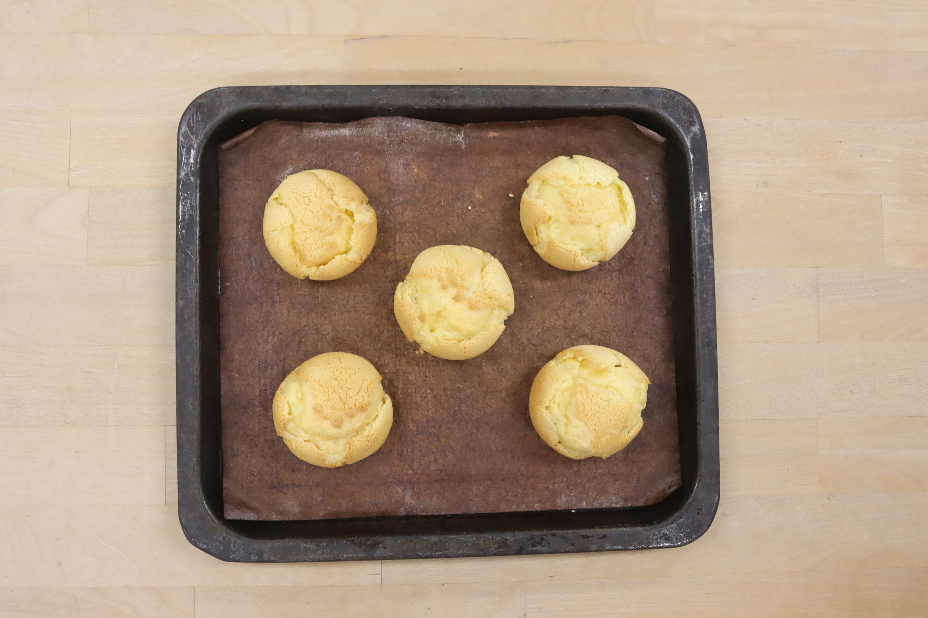焼成すると約6㎝のクッキーシューが出来上がるので、お好みでホイップやカスタードを入れてお召上がりください☺