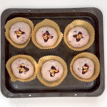 パン上部に十字に切り込みを入れ、ブルーベリーホールとクルミをお好みでのせます