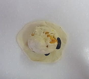 成型する。 白生地をを丸く伸ばしてオレンジ生地をそれぞれ包み合わせる。 オレンジ生地に黒豆を2粒包み込み、外側に4粒付けて、黒豆が上側になるように白生地で覆い被せて丸める。