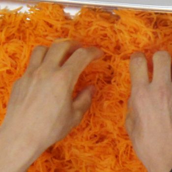 キャロットラぺを作る。 人参を千切りにしたら塩もみする。 ※あらかじめ仕込んでおくとスムーズです。