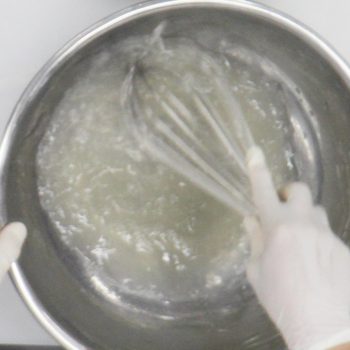 サラモイアを作る。熱湯と岩塩を泡だて器でしっかり混ぜわせる。