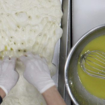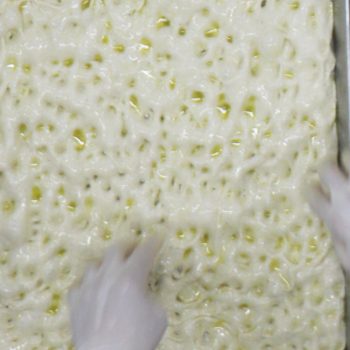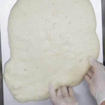 伸ばした生地に指で穴を開けながらサラモイアを馴染ませる。