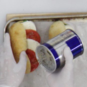 発酵後、表面にオリーブオイルを塗り、岩塩を振りかけて、200℃のオーブンでスチームを入れながら約10分焼成する。