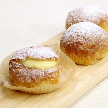 粗熱が取れたら、型から外し、ホイップを15gずつ注入する。 仕上げに粉糖をふったら完成!!