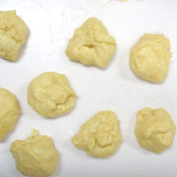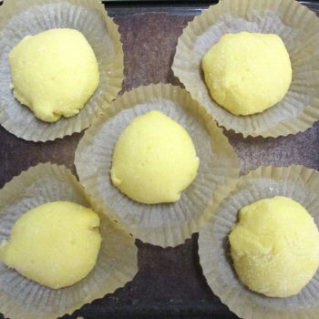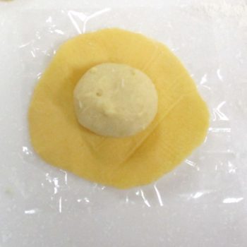 生地を丸めなおし、準備しておいたメロン皮で包み込むように成形します。 そして表面にグラニュー糖をまぶします。