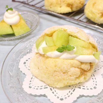 粗熱が取れたら、切込みを入れ、生クリームとメロンを挟んで完成です。