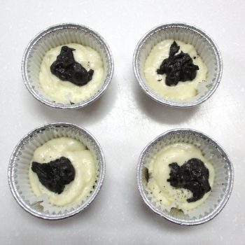 アルミ丸型の中にグラシンを入れ、その中に【1】の残りの生地を45~50gずつ12等分して入れていきます。 そしてそのうちの6個に約15gずつ【2】で作ったココア生地を入れます。