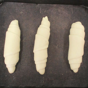 縦長の二等辺三角形にする。 細長く切った有塩バターを横軸にして巻き、中心が膨らんだ形にする。