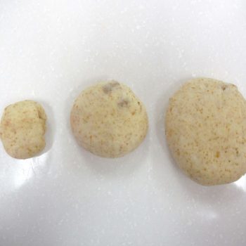 ガス抜き及び分割(大:約120g、中:約60g、小:約20g各3個ずつ)を行い、約20分ベンチタイムをとります