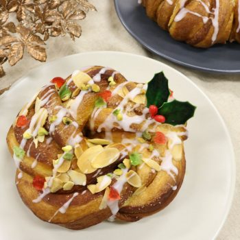 焼成後粉糖に水、ラム酒を加えてよく混ぜたアイシングシュガーをかけてドレンチェリーやピスタチオダイスなどのトッピングで仕上げます