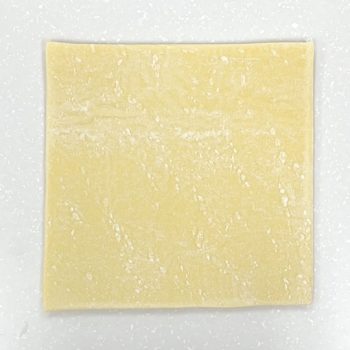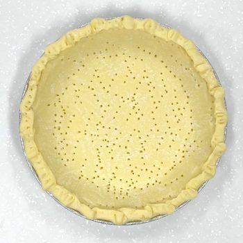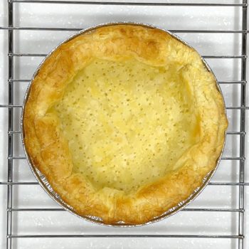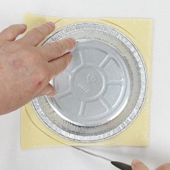 冷凍パイシートにアルミ製パイ皿を被せ、ひとまわり大きくナイフでカットし、型に敷きます。 -