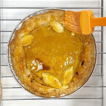 残り生地で作った飾りをトッピングし、塗り卵をします。