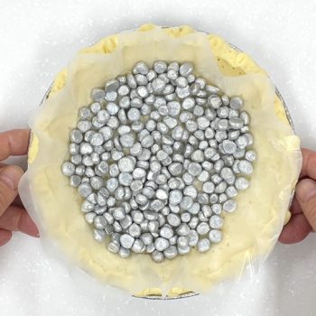 生地の上に敷紙を乗せ、その上にタルトストーンを置きます。