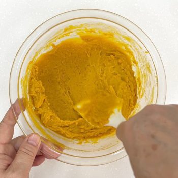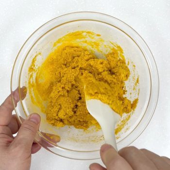 ボウルにかぼちゃフレークと牛乳を加え、混ぜます。 -