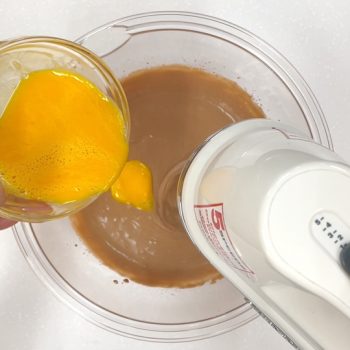 溶きほぐした全卵を加えながら混ぜます。(ハンドミキサーで約1分程)