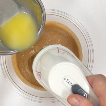 溶かしたバターを加えながら混ぜます。(ハンドミキサーで約30秒程)