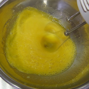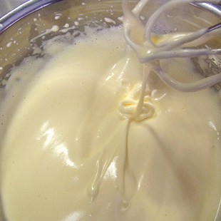 生地に熱が付いて、白っぽくもったりとしてきたら湯煎からはずして更にキメを整えるよう、ハンドミキサーの速度を緩めながらなめらかな生地を作ります。