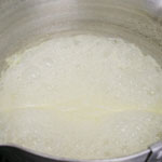小鍋に生クリームを入れ弱火にかけます。沸騰するまで温まったら火を止めます。 ※生クリームは中までしっかり沸かします。最初は周りだけがふつふつするので、注意して下さい。