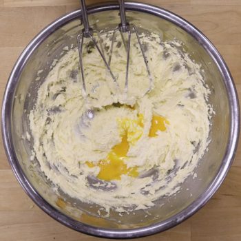 グラニュー糖を数回に分けて加え混ぜ、塩を加えた溶き卵を少量ずつ加え、その都度よく混ぜる