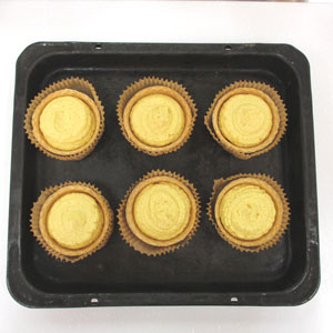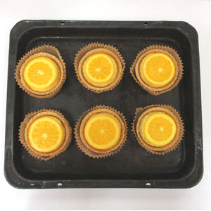 上面にオレンジスライスを1枚ずつ乗せ、余熱したオーブンで約30分焼成します。