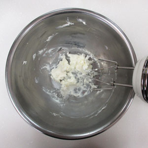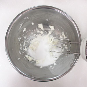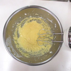 砂糖を3~4回に分けて加え、その都度しっかりと白っぽくなるまで混ぜます。