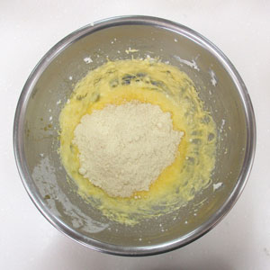 洋酒を加えて混ぜたらアーモンドプードルを加えて混ぜます。