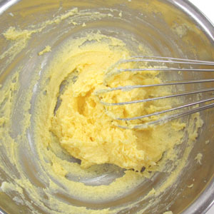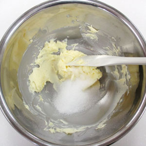 室温に戻した無塩マーガリンをホイッパーで練り、砂糖を加えよくすり混ぜます