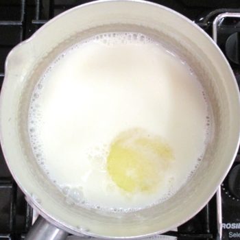 沸いたら1~2分煮て、牛乳、砂糖を加えて溶かし火を止めてゼラチンを加えて混ぜる。