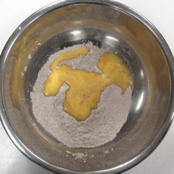ボウルにふるった☆の粉類をいれて、溶きほぐした全卵と牛乳1/3を加えて、中心から滑らかになるまで混ぜます
