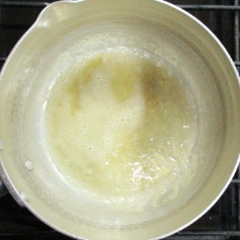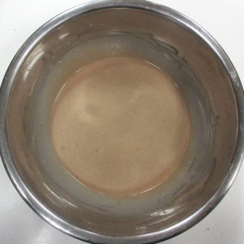 【1】のバター、洋酒を加えて混ぜたら、残りの牛乳を加えます ラップをして30~1時間休ませます