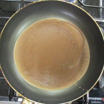 フッ素加工されたフライパンをよく熱して、火から下ろし、濡れ布巾の上で熱を取り、再び火にかけます 生地を薄く流してフライパンを回しながら生地を広げて焼きます