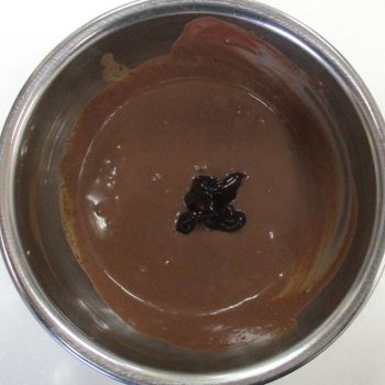 次にカシスチョコレートソースを作ります チョコレートをボウルに入れ、沸かした牛乳を加えてよく混ぜます