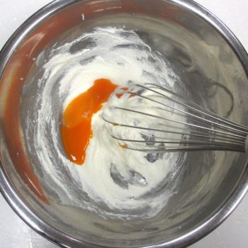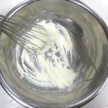 別のボウルにバターを入れて室温に戻し、砂糖を加えて白っぽくなるまでよく混ぜます