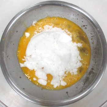 ボウルに全卵2個を割りほぐし、砂糖を加えてすぐ、湯銭にかけて泡立てます