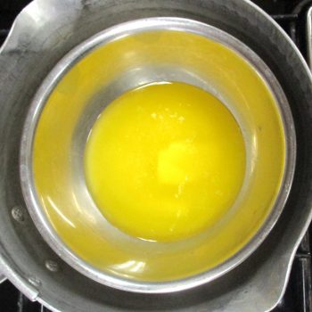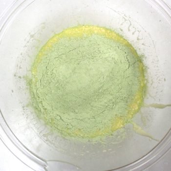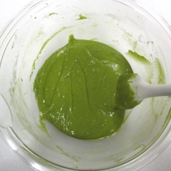混ざったら、下準備で溶かしたバターの中に生地の一部分を入れ、よく混ぜ合わせたら、元のボウルに戻し入れ、よく混ぜます