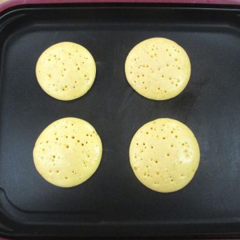 泡が浮き上がってしばらく寝かせたら、ホットプレートに生地を落として焼きます (直径7~8㎝)