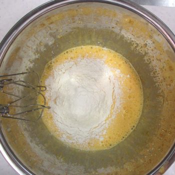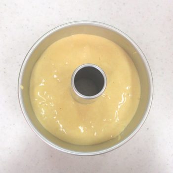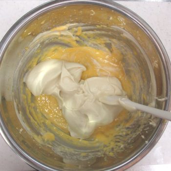 4)のボウルにメレンゲをひとすくい加えて混ぜ、残りは2会程度に分けて気泡をつぶさないように混ぜます