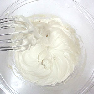 卵の卵白のみをボウルに入れてほぐし、ハンドミキサーで泡立てる。白っぽく泡立ってきたらきび砂糖を数回に分けて加えながら、しっかりと角が立つような固めのメレンゲを作る。