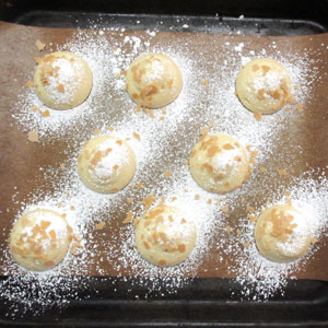 表面に粉糖を振り(2、3回)、その上にフィアンティーヌをトッピングして180℃に予熱したオーブンで、約12~13分焼成する。