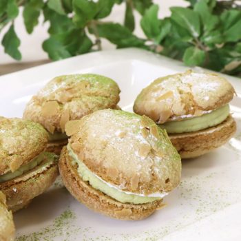 焼きあがったら網の上で冷まし、白あんと抹茶を混ぜた抹茶あんとマスカルポーネを2枚で挟んで仕上げる。