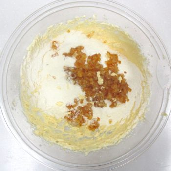 そして洋酒を加えたブラッドオレンジピールを散らして、粉をまぶすようにしながらしっかりとツヤよく混ぜます