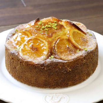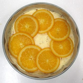 型に流し入れてオレンジスライスをのせ、170℃で約50~60分焼成します