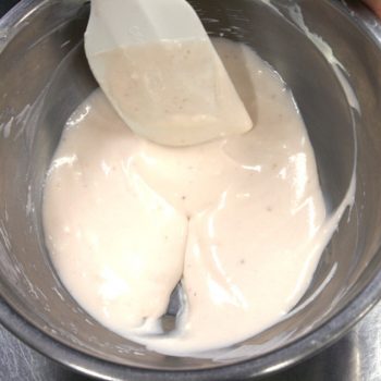 マヨネーズ状にした無塩マーガリン(バター)と牛乳を加え、混ぜ合わせておきます(A)