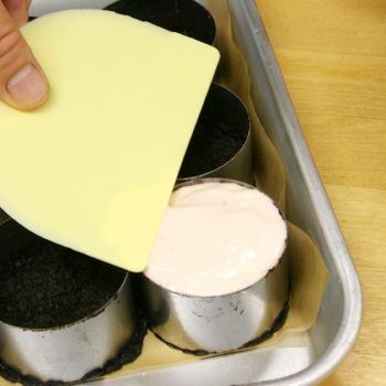 冷蔵庫で冷やしておいたセルクル型に流し入れ、再度冷蔵庫で冷やします。表面をカードでならすと綺麗!
