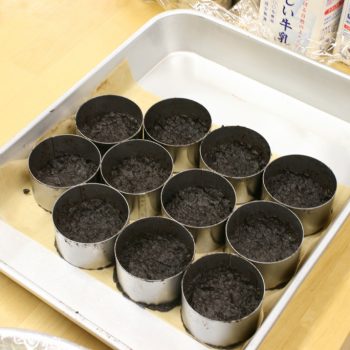 ラップを敷いたバットにセルクルを並べ、(A)の生地を敷き詰め、強く押し固めます。